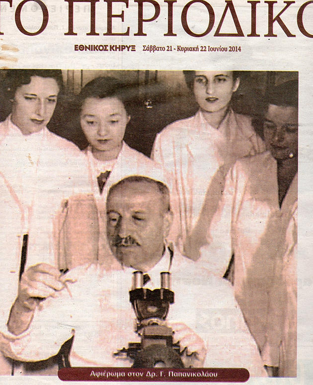Εξώφυλλο από το ένθετο του Εθνικού Κήρυκα με αφιέρωμα για τον μεγάλο Έλληνα της ομογένειας΄των Η.Π.Α. , τον γιατρό Γεώργιο Παπανικολάου, που δημοσιεύθηκε στις 21 Ιουνίου, 2014 σε συνεργασία με τον Σύλλογο Ελλήνων Εκπαιδευτικών "Προμηεθύς". Αναδημοσίευση από τον ιστότοπο του Προμηθέα www.greekteahersprometheus.org.